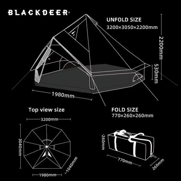 - تهویه: چادر های بلک دیر معمولا دارای پنجره های تهویه با توری برای جلوگیری از ورود حشرات و بهبود جریان هوا هستند. همچنین دارای درب های دو لایه با پارچه و طوری هستند.
